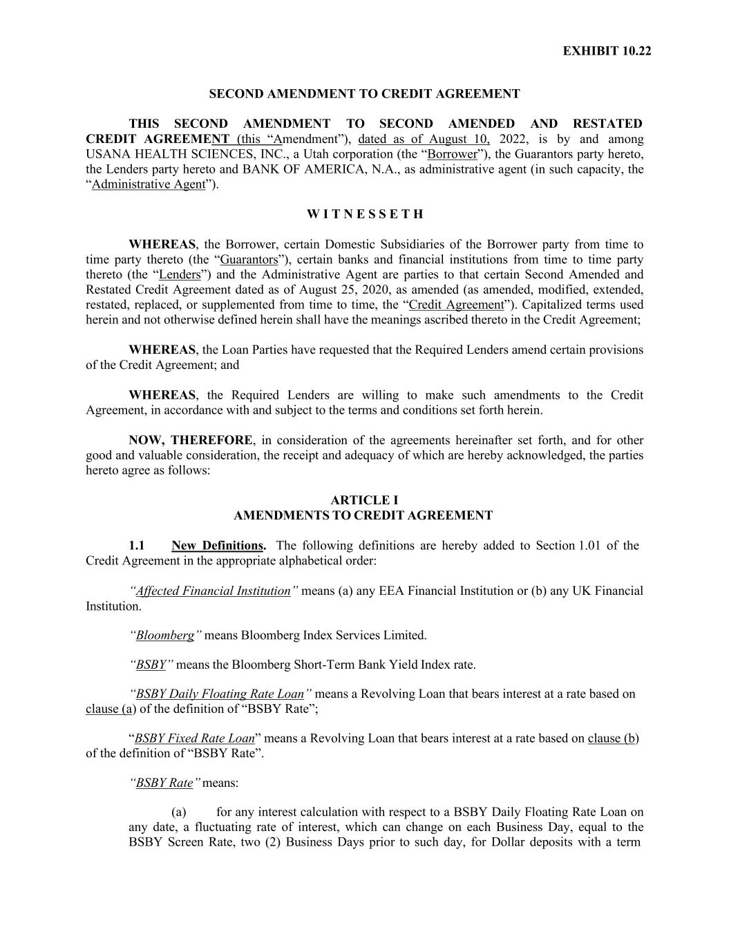 EXHIBIT 10.22 SECOND AMENDMENT TO CREDIT AGREEMENT THIS SECOND AMENDMENT TO SECOND AMENDED AND RESTATED CREDIT AGREEMENT (this “Amendment”), dated as of August 10, 2022, is by and among USANA HEALTH SCIENCES, INC., a Utah corporation (the “Borrower”), the Guarantors party hereto, the Lenders party hereto and BANK OF AMERICA, N.A., as administrative agent (in such capacity, the “Administrative Agent”). W I T N E S S E T H WHEREAS, the Borrower, certain Domestic Subsidiaries of the Borrower party from time to time party thereto (the “Guarantors”), certain banks and financial institutions from time to time party thereto (the “Lenders”) and the Administrative Agent are parties to that certain Second Amended and Restated Credit Agreement dated as of August 25, 2020, as amended (as amended, modified, extended, restated, replaced, or supplemented from time to time, the “Credit Agreement”). Capitalized terms used herein and not otherwise defined herein shall have the meanings ascribed thereto in the Credit Agreement; WHEREAS, the Loan Parties have requested that the Required Lenders amend certain provisions of the Credit Agreement; and WHEREAS, the Required Lenders are willing to make such amendments to the Credit Agreement, in accordance with and subject to the terms and conditions set forth herein. NOW, THEREFORE, in consideration of the agreements hereinafter set forth, and for other good and valuable consideration, the receipt and adequacy of which are hereby acknowledged, the parties hereto agree as follows: ARTICLE I AMENDMENTS TO CREDIT AGREEMENT 1.1 New Definitions. The following definitions are hereby added to Section 1.01 of the Credit Agreement in the appropriate alphabetical order: “Affected Financial Institution” means (a) any EEA Financial Institution or (b) any UK Financial Institution. “Bloomberg” means Bloomberg Index Services Limited. “BSBY” means the Bloomberg Short-Term Bank Yield Index rate. “BSBY Daily Floating Rate Loan” means a Revolving Loan that bears interest at a rate based on clause (a) of the definition of “BSBY Rate”; “BSBY Fixed Rate Loan” means a Revolving Loan that bears interest at a rate based on clause (b) of the definition of “BSBY Rate”. “BSBY Rate” means: (a) for any interest calculation with respect to a BSBY Daily Floating Rate Loan on any date, a fluctuating rate of interest, which can change on each Business Day, equal to the BSBY Screen Rate, two (2) Business Days prior to such day, for Dollar deposits with a term