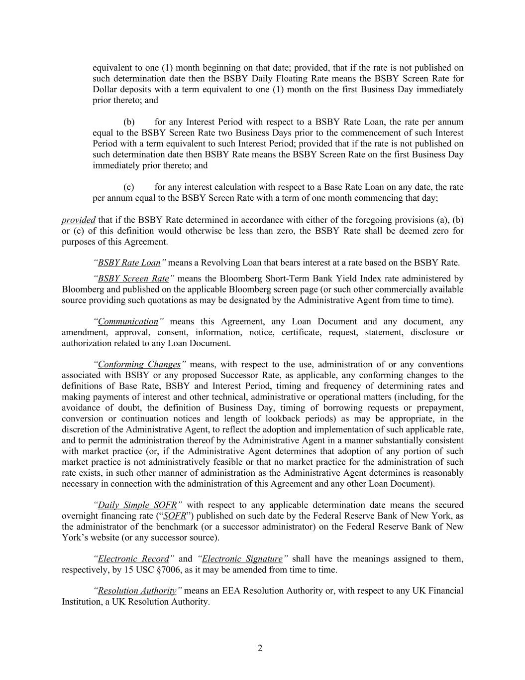 2 equivalent to one (1) month beginning on that date; provided, that if the rate is not published on such determination date then the BSBY Daily Floating Rate means the BSBY Screen Rate for Dollar deposits with a term equivalent to one (1) month on the first Business Day immediately prior thereto; and (b) for any Interest Period with respect to a BSBY Rate Loan, the rate per annum equal to the BSBY Screen Rate two Business Days prior to the commencement of such Interest Period with a term equivalent to such Interest Period; provided that if the rate is not published on such determination date then BSBY Rate means the BSBY Screen Rate on the first Business Day immediately prior thereto; and (c) for any interest calculation with respect to a Base Rate Loan on any date, the rate per annum equal to the BSBY Screen Rate with a term of one month commencing that day; provided that if the BSBY Rate determined in accordance with either of the foregoing provisions (a), (b) or (c) of this definition would otherwise be less than zero, the BSBY Rate shall be deemed zero for purposes of this Agreement. “BSBY Rate Loan” means a Revolving Loan that bears interest at a rate based on the BSBY Rate. “BSBY Screen Rate” means the Bloomberg Short-Term Bank Yield Index rate administered by Bloomberg and published on the applicable Bloomberg screen page (or such other commercially available source providing such quotations as may be designated by the Administrative Agent from time to time). “Communication” means this Agreement, any Loan Document and any document, any amendment, approval, consent, information, notice, certificate, request, statement, disclosure or authorization related to any Loan Document. “Conforming Changes” means, with respect to the use, administration of or any conventions associated with BSBY or any proposed Successor Rate, as applicable, any conforming changes to the definitions of Base Rate, BSBY and Interest Period, timing and frequency of determining rates and making payments of interest and other technical, administrative or operational matters (including, for the avoidance of doubt, the definition of Business Day, timing of borrowing requests or prepayment, conversion or continuation notices and length of lookback periods) as may be appropriate, in the discretion of the Administrative Agent, to reflect the adoption and implementation of such applicable rate, and to permit the administration thereof by the Administrative Agent in a manner substantially consistent with market practice (or, if the Administrative Agent determines that adoption of any portion of such market practice is not administratively feasible or that no market practice for the administration of such rate exists, in such other manner of administration as the Administrative Agent determines is reasonably necessary in connection with the administration of this Agreement and any other Loan Document). “Daily Simple SOFR” with respect to any applicable determination date means the secured overnight financing rate (“SOFR”) published on such date by the Federal Reserve Bank of New York, as the administrator of the benchmark (or a successor administrator) on the Federal Reserve Bank of New York’s website (or any successor source). “Electronic Record” and “Electronic Signature” shall have the meanings assigned to them, respectively, by 15 USC §7006, as it may be amended from time to time. “Resolution Authority” means an EEA Resolution Authority or, with respect to any UK Financial Institution, a UK Resolution Authority.