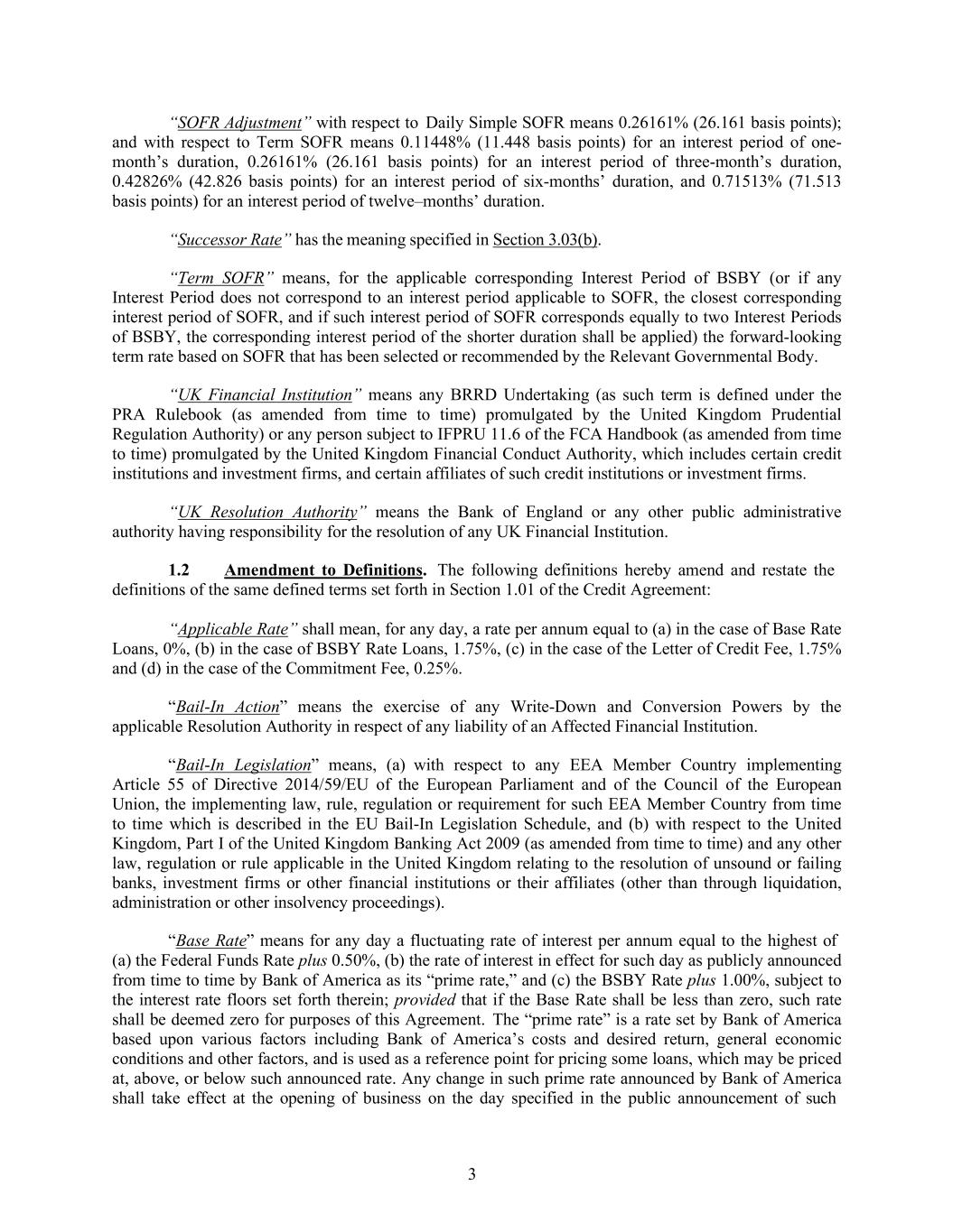 3 “SOFR Adjustment” with respect to Daily Simple SOFR means 0.26161% (26.161 basis points); and with respect to Term SOFR means 0.11448% (11.448 basis points) for an interest period of one- month’s duration, 0.26161% (26.161 basis points) for an interest period of three-month’s duration, 0.42826% (42.826 basis points) for an interest period of six-months’ duration, and 0.71513% (71.513 basis points) for an interest period of twelve–months’ duration. “Successor Rate” has the meaning specified in Section 3.03(b). “Term SOFR” means, for the applicable corresponding Interest Period of BSBY (or if any Interest Period does not correspond to an interest period applicable to SOFR, the closest corresponding interest period of SOFR, and if such interest period of SOFR corresponds equally to two Interest Periods of BSBY, the corresponding interest period of the shorter duration shall be applied) the forward-looking term rate based on SOFR that has been selected or recommended by the Relevant Governmental Body. “UK Financial Institution” means any BRRD Undertaking (as such term is defined under the PRA Rulebook (as amended from time to time) promulgated by the United Kingdom Prudential Regulation Authority) or any person subject to IFPRU 11.6 of the FCA Handbook (as amended from time to time) promulgated by the United Kingdom Financial Conduct Authority, which includes certain credit institutions and investment firms, and certain affiliates of such credit institutions or investment firms. “UK Resolution Authority” means the Bank of England or any other public administrative authority having responsibility for the resolution of any UK Financial Institution. 1.2 Amendment to Definitions. The following definitions hereby amend and restate the definitions of the same defined terms set forth in Section 1.01 of the Credit Agreement: “Applicable Rate” shall mean, for any day, a rate per annum equal to (a) in the case of Base Rate Loans, 0%, (b) in the case of BSBY Rate Loans, 1.75%, (c) in the case of the Letter of Credit Fee, 1.75% and (d) in the case of the Commitment Fee, 0.25%. “Bail-In Action” means the exercise of any Write-Down and Conversion Powers by the applicable Resolution Authority in respect of any liability of an Affected Financial Institution. “Bail-In Legislation” means, (a) with respect to any EEA Member Country implementing Article 55 of Directive 2014/59/EU of the European Parliament and of the Council of the European Union, the implementing law, rule, regulation or requirement for such EEA Member Country from time to time which is described in the EU Bail-In Legislation Schedule, and (b) with respect to the United Kingdom, Part I of the United Kingdom Banking Act 2009 (as amended from time to time) and any other law, regulation or rule applicable in the United Kingdom relating to the resolution of unsound or failing banks, investment firms or other financial institutions or their affiliates (other than through liquidation, administration or other insolvency proceedings). “Base Rate” means for any day a fluctuating rate of interest per annum equal to the highest of (a) the Federal Funds Rate plus 0.50%, (b) the rate of interest in effect for such day as publicly announced from time to time by Bank of America as its “prime rate,” and (c) the BSBY Rate plus 1.00%, subject to the interest rate floors set forth therein; provided that if the Base Rate shall be less than zero, such rate shall be deemed zero for purposes of this Agreement. The “prime rate” is a rate set by Bank of America based upon various factors including Bank of America’s costs and desired return, general economic conditions and other factors, and is used as a reference point for pricing some loans, which may be priced at, above, or below such announced rate. Any change in such prime rate announced by Bank of America shall take effect at the opening of business on the day specified in the public announcement of such