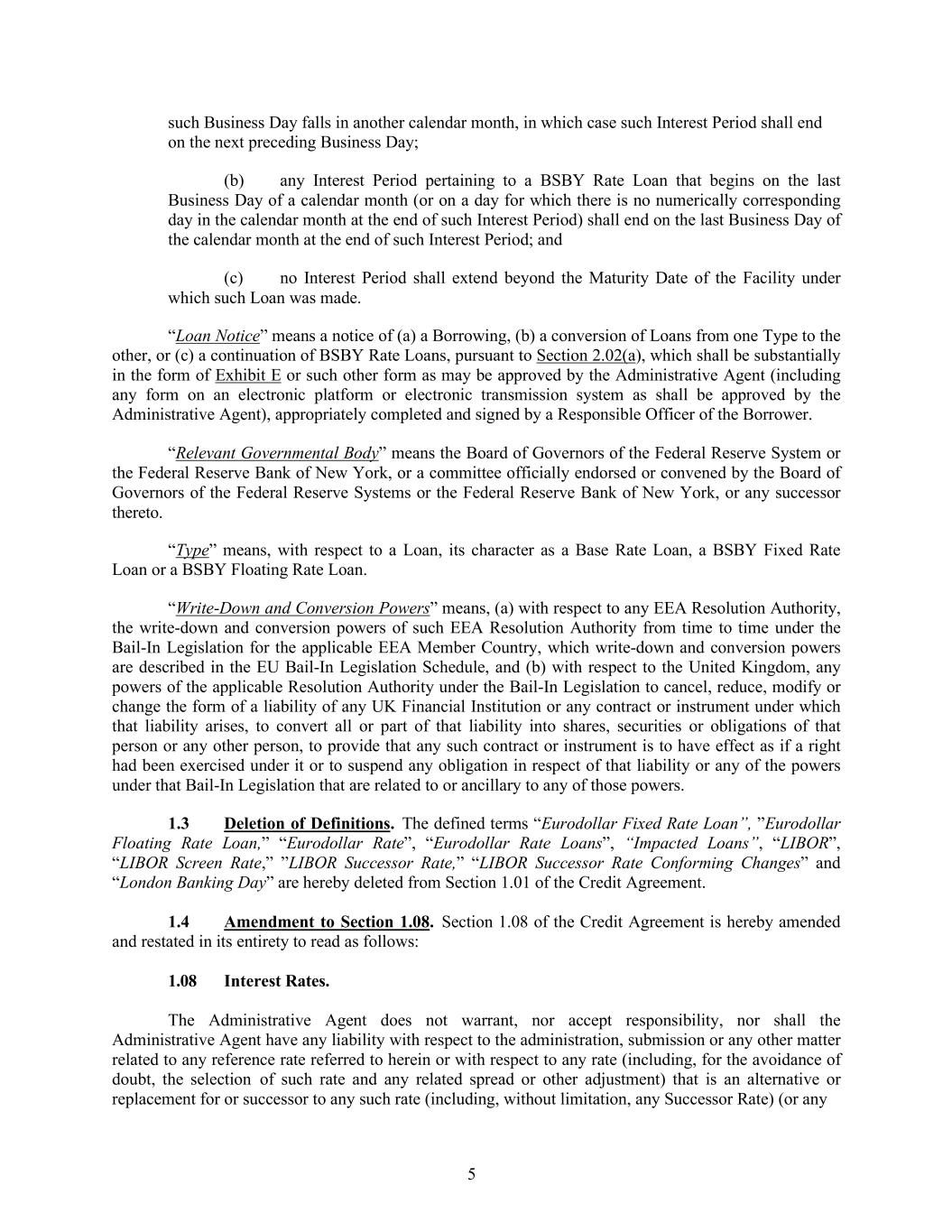 5 such Business Day falls in another calendar month, in which case such Interest Period shall end on the next preceding Business Day; (b) any Interest Period pertaining to a BSBY Rate Loan that begins on the last Business Day of a calendar month (or on a day for which there is no numerically corresponding day in the calendar month at the end of such Interest Period) shall end on the last Business Day of the calendar month at the end of such Interest Period; and (c) no Interest Period shall extend beyond the Maturity Date of the Facility under which such Loan was made. “Loan Notice” means a notice of (a) a Borrowing, (b) a conversion of Loans from one Type to the other, or (c) a continuation of BSBY Rate Loans, pursuant to Section 2.02(a), which shall be substantially in the form of Exhibit E or such other form as may be approved by the Administrative Agent (including any form on an electronic platform or electronic transmission system as shall be approved by the Administrative Agent), appropriately completed and signed by a Responsible Officer of the Borrower. “Relevant Governmental Body” means the Board of Governors of the Federal Reserve System or the Federal Reserve Bank of New York, or a committee officially endorsed or convened by the Board of Governors of the Federal Reserve Systems or the Federal Reserve Bank of New York, or any successor thereto. “Type” means, with respect to a Loan, its character as a Base Rate Loan, a BSBY Fixed Rate Loan or a BSBY Floating Rate Loan. “Write-Down and Conversion Powers” means, (a) with respect to any EEA Resolution Authority, the write-down and conversion powers of such EEA Resolution Authority from time to time under the Bail-In Legislation for the applicable EEA Member Country, which write-down and conversion powers are described in the EU Bail-In Legislation Schedule, and (b) with respect to the United Kingdom, any powers of the applicable Resolution Authority under the Bail-In Legislation to cancel, reduce, modify or change the form of a liability of any UK Financial Institution or any contract or instrument under which that liability arises, to convert all or part of that liability into shares, securities or obligations of that person or any other person, to provide that any such contract or instrument is to have effect as if a right had been exercised under it or to suspend any obligation in respect of that liability or any of the powers under that Bail-In Legislation that are related to or ancillary to any of those powers. 1.3 Deletion of Definitions. The defined terms “Eurodollar Fixed Rate Loan”, ”Eurodollar Floating Rate Loan,” “Eurodollar Rate”, “Eurodollar Rate Loans”, “Impacted Loans”, “LIBOR”, “LIBOR Screen Rate,” ”LIBOR Successor Rate,” “LIBOR Successor Rate Conforming Changes” and “London Banking Day” are hereby deleted from Section 1.01 of the Credit Agreement. 1.4 Amendment to Section 1.08. Section 1.08 of the Credit Agreement is hereby amended and restated in its entirety to read as follows: 1.08 Interest Rates. The Administrative Agent does not warrant, nor accept responsibility, nor shall the Administrative Agent have any liability with respect to the administration, submission or any other matter related to any reference rate referred to herein or with respect to any rate (including, for the avoidance of doubt, the selection of such rate and any related spread or other adjustment) that is an alternative or replacement for or successor to any such rate (including, without limitation, any Successor Rate) (or any