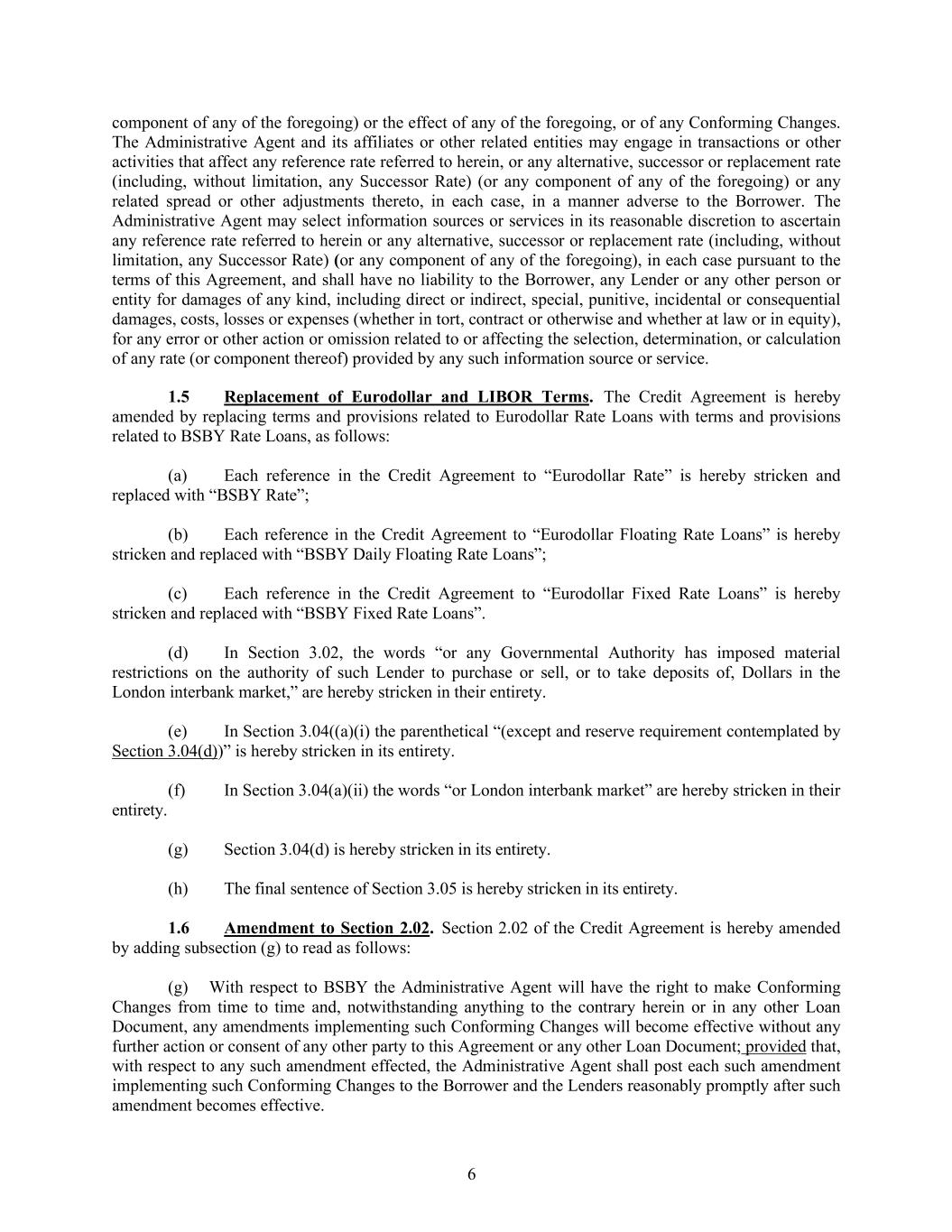 6 component of any of the foregoing) or the effect of any of the foregoing, or of any Conforming Changes. The Administrative Agent and its affiliates or other related entities may engage in transactions or other activities that affect any reference rate referred to herein, or any alternative, successor or replacement rate (including, without limitation, any Successor Rate) (or any component of any of the foregoing) or any related spread or other adjustments thereto, in each case, in a manner adverse to the Borrower. The Administrative Agent may select information sources or services in its reasonable discretion to ascertain any reference rate referred to herein or any alternative, successor or replacement rate (including, without limitation, any Successor Rate) (or any component of any of the foregoing), in each case pursuant to the terms of this Agreement, and shall have no liability to the Borrower, any Lender or any other person or entity for damages of any kind, including direct or indirect, special, punitive, incidental or consequential damages, costs, losses or expenses (whether in tort, contract or otherwise and whether at law or in equity), for any error or other action or omission related to or affecting the selection, determination, or calculation of any rate (or component thereof) provided by any such information source or service. 1.5 Replacement of Eurodollar and LIBOR Terms. The Credit Agreement is hereby amended by replacing terms and provisions related to Eurodollar Rate Loans with terms and provisions related to BSBY Rate Loans, as follows: (a) Each reference in the Credit Agreement to “Eurodollar Rate” is hereby stricken and replaced with “BSBY Rate”; (b) Each reference in the Credit Agreement to “Eurodollar Floating Rate Loans” is hereby stricken and replaced with “BSBY Daily Floating Rate Loans”; (c) Each reference in the Credit Agreement to “Eurodollar Fixed Rate Loans” is hereby stricken and replaced with “BSBY Fixed Rate Loans”. (d) In Section 3.02, the words “or any Governmental Authority has imposed material restrictions on the authority of such Lender to purchase or sell, or to take deposits of, Dollars in the London interbank market,” are hereby stricken in their entirety. (e) In Section 3.04((a)(i) the parenthetical “(except and reserve requirement contemplated by Section 3.04(d))” is hereby stricken in its entirety. (f) In Section 3.04(a)(ii) the words “or London interbank market” are hereby stricken in their entirety. (g) Section 3.04(d) is hereby stricken in its entirety. (h) The final sentence of Section 3.05 is hereby stricken in its entirety. 1.6 Amendment to Section 2.02. Section 2.02 of the Credit Agreement is hereby amended by adding subsection (g) to read as follows: (g) With respect to BSBY the Administrative Agent will have the right to make Conforming Changes from time to time and, notwithstanding anything to the contrary herein or in any other Loan Document, any amendments implementing such Conforming Changes will become effective without any further action or consent of any other party to this Agreement or any other Loan Document; provided that, with respect to any such amendment effected, the Administrative Agent shall post each such amendment implementing such Conforming Changes to the Borrower and the Lenders reasonably promptly after such amendment becomes effective.