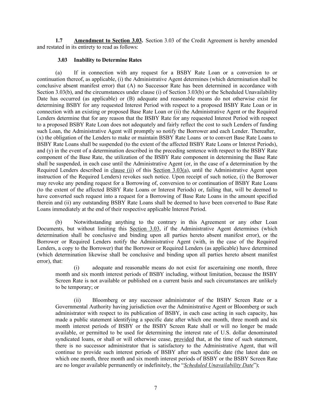 7 1.7 Amendment to Section 3.03. Section 3.03 of the Credit Agreement is hereby amended and restated in its entirety to read as follows: 3.03 Inability to Determine Rates (a) If in connection with any request for a BSBY Rate Loan or a conversion to or continuation thereof, as applicable, (i) the Administrative Agent determines (which determination shall be conclusive absent manifest error) that (A) no Successor Rate has been determined in accordance with Section 3.03(b), and the circumstances under clause (i) of Section 3.03(b) or the Scheduled Unavailability Date has occurred (as applicable) or (B) adequate and reasonable means do not otherwise exist for determining BSBY for any requested Interest Period with respect to a proposed BSBY Rate Loan or in connection with an existing or proposed Base Rate Loan or (ii) the Administrative Agent or the Required Lenders determine that for any reason that the BSBY Rate for any requested Interest Period with respect to a proposed BSBY Rate Loan does not adequately and fairly reflect the cost to such Lenders of funding such Loan, the Administrative Agent will promptly so notify the Borrower and each Lender. Thereafter, (x) the obligation of the Lenders to make or maintain BSBY Rate Loans or to convert Base Rate Loans to BSBY Rate Loans shall be suspended (to the extent of the affected BSBY Rate Loans or Interest Periods), and (y) in the event of a determination described in the preceding sentence with respect to the BSBY Rate component of the Base Rate, the utilization of the BSBY Rate component in determining the Base Rate shall be suspended, in each case until the Administrative Agent (or, in the case of a determination by the Required Lenders described in clause (ii) of this Section 3.03(a), until the Administrative Agent upon instruction of the Required Lenders) revokes such notice. Upon receipt of such notice, (i) the Borrower may revoke any pending request for a Borrowing of, conversion to or continuation of BSBY Rate Loans (to the extent of the affected BSBY Rate Loans or Interest Periods) or, failing that, will be deemed to have converted such request into a request for a Borrowing of Base Rate Loans in the amount specified therein and (ii) any outstanding BSBY Rate Loans shall be deemed to have been converted to Base Rate Loans immediately at the end of their respective applicable Interest Period. (b) Notwithstanding anything to the contrary in this Agreement or any other Loan Documents, but without limiting this Section 3.03, if the Administrative Agent determines (which determination shall be conclusive and binding upon all parties hereto absent manifest error), or the Borrower or Required Lenders notify the Administrative Agent (with, in the case of the Required Lenders, a copy to the Borrower) that the Borrower or Required Lenders (as applicable) have determined (which determination likewise shall be conclusive and binding upon all parties hereto absent manifest error), that: (i) adequate and reasonable means do not exist for ascertaining one month, three month and six month interest periods of BSBY including, without limitation, because the BSBY Screen Rate is not available or published on a current basis and such circumstances are unlikely to be temporary; or (ii) Bloomberg or any successor administrator of the BSBY Screen Rate or a Governmental Authority having jurisdiction over the Administrative Agent or Bloomberg or such administrator with respect to its publication of BSBY, in each case acting in such capacity, has made a public statement identifying a specific date after which one month, three month and six month interest periods of BSBY or the BSBY Screen Rate shall or will no longer be made available, or permitted to be used for determining the interest rate of U.S. dollar denominated syndicated loans, or shall or will otherwise cease, provided that, at the time of such statement, there is no successor administrator that is satisfactory to the Administrative Agent, that will continue to provide such interest periods of BSBY after such specific date (the latest date on which one month, three month and six month interest periods of BSBY or the BSBY Screen Rate are no longer available permanently or indefinitely, the “Scheduled Unavailability Date”);