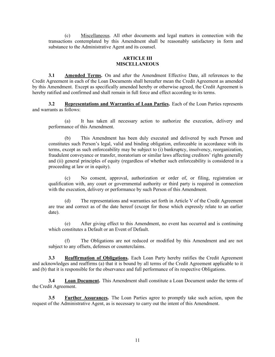 11 (c) Miscellaneous. All other documents and legal matters in connection with the transactions contemplated by this Amendment shall be reasonably satisfactory in form and substance to the Administrative Agent and its counsel. ARTICLE III MISCELLANEOUS 3.1 Amended Terms. On and after the Amendment Effective Date, all references to the Credit Agreement in each of the Loan Documents shall hereafter mean the Credit Agreement as amended by this Amendment. Except as specifically amended hereby or otherwise agreed, the Credit Agreement is hereby ratified and confirmed and shall remain in full force and effect according to its terms. 3.2 Representations and Warranties of Loan Parties. Each of the Loan Parties represents and warrants as follows: (a) It has taken all necessary action to authorize the execution, delivery and performance of this Amendment. (b) This Amendment has been duly executed and delivered by such Person and constitutes such Person’s legal, valid and binding obligation, enforceable in accordance with its terms, except as such enforceability may be subject to (i) bankruptcy, insolvency, reorganization, fraudulent conveyance or transfer, moratorium or similar laws affecting creditors’ rights generally and (ii) general principles of equity (regardless of whether such enforceability is considered in a proceeding at law or in equity). (c) No consent, approval, authorization or order of, or filing, registration or qualification with, any court or governmental authority or third party is required in connection with the execution, delivery or performance by such Person of this Amendment. (d) The representations and warranties set forth in Article V of the Credit Agreement are true and correct as of the date hereof (except for those which expressly relate to an earlier date). (e) After giving effect to this Amendment, no event has occurred and is continuing which constitutes a Default or an Event of Default. (f) The Obligations are not reduced or modified by this Amendment and are not subject to any offsets, defenses or counterclaims. 3.3 Reaffirmation of Obligations. Each Loan Party hereby ratifies the Credit Agreement and acknowledges and reaffirms (a) that it is bound by all terms of the Credit Agreement applicable to it and (b) that it is responsible for the observance and full performance of its respective Obligations. 3.4 Loan Document. This Amendment shall constitute a Loan Document under the terms of the Credit Agreement. 3.5 Further Assurances. The Loan Parties agree to promptly take such action, upon the request of the Administrative Agent, as is necessary to carry out the intent of this Amendment.