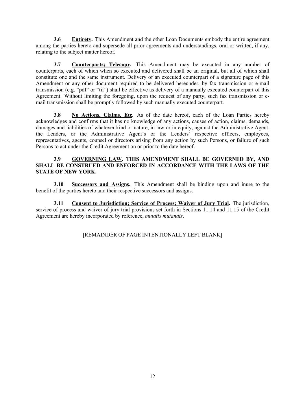 12 3.6 Entirety. This Amendment and the other Loan Documents embody the entire agreement among the parties hereto and supersede all prior agreements and understandings, oral or written, if any, relating to the subject matter hereof. 3.7 Counterparts; Telecopy. This Amendment may be executed in any number of counterparts, each of which when so executed and delivered shall be an original, but all of which shall constitute one and the same instrument. Delivery of an executed counterpart of a signature page of this Amendment or any other document required to be delivered hereunder, by fax transmission or e-mail transmission (e.g. “pdf” or “tif”) shall be effective as delivery of a manually executed counterpart of this Agreement. Without limiting the foregoing, upon the request of any party, such fax transmission or e- mail transmission shall be promptly followed by such manually executed counterpart. 3.8 No Actions, Claims, Etc. As of the date hereof, each of the Loan Parties hereby acknowledges and confirms that it has no knowledge of any actions, causes of action, claims, demands, damages and liabilities of whatever kind or nature, in law or in equity, against the Administrative Agent, the Lenders, or the Administrative Agent’s or the Lenders’ respective officers, employees, representatives, agents, counsel or directors arising from any action by such Persons, or failure of such Persons to act under the Credit Agreement on or prior to the date hereof. 3.9 GOVERNING LAW. THIS AMENDMENT SHALL BE GOVERNED BY, AND SHALL BE CONSTRUED AND ENFORCED IN ACCORDANCE WITH THE LAWS OF THE STATE OF NEW YORK. 3.10 Successors and Assigns. This Amendment shall be binding upon and inure to the benefit of the parties hereto and their respective successors and assigns. 3.11 Consent to Jurisdiction; Service of Process; Waiver of Jury Trial. The jurisdiction, service of process and waiver of jury trial provisions set forth in Sections 11.14 and 11.15 of the Credit Agreement are hereby incorporated by reference, mutatis mutandis. [REMAINDER OF PAGE INTENTIONALLY LEFT BLANK]