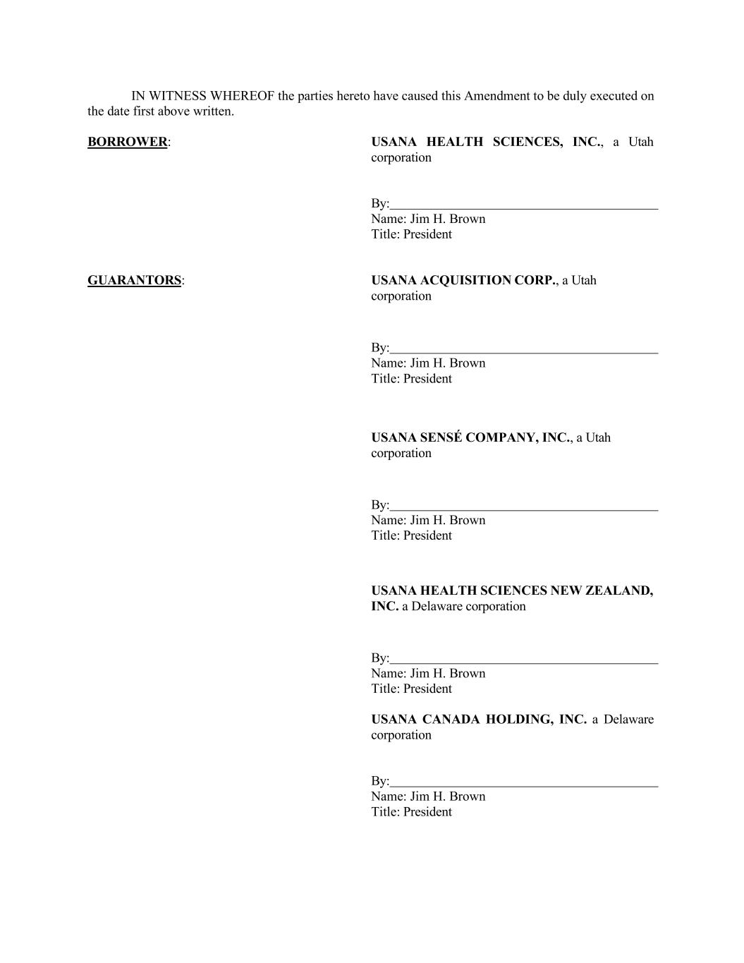 IN WITNESS WHEREOF the parties hereto have caused this Amendment to be duly executed on the date first above written. BORROWER: USANA HEALTH SCIENCES, INC., a Utah corporation By: Name: Jim H. Brown Title: President GUARANTORS: USANA ACQUISITION CORP., a Utah corporation By: Name: Jim H. Brown Title: President USANA SENSÉ COMPANY, INC., a Utah corporation By: Name: Jim H. Brown Title: President USANA HEALTH SCIENCES NEW ZEALAND, INC. a Delaware corporation By: Name: Jim H. Brown Title: President USANA CANADA HOLDING, INC. a Delaware corporation By: Name: Jim H. Brown Title: President