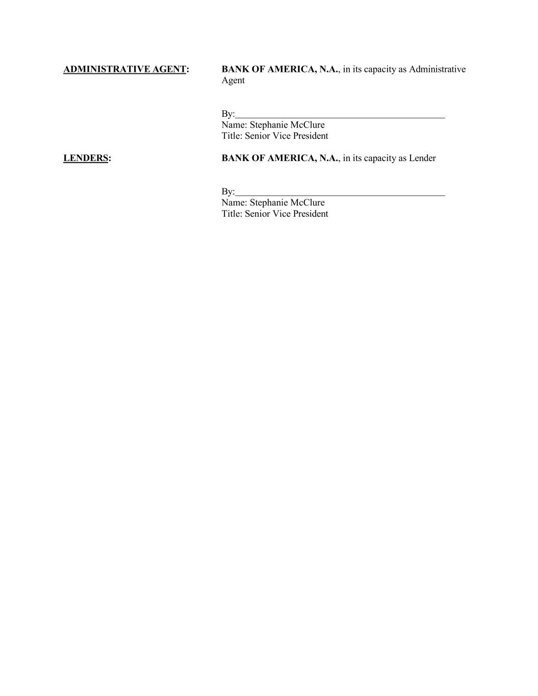 ADMINISTRATIVE AGENT: BANK OF AMERICA, N.A., in its capacity as Administrative Agent By: Name: Stephanie McClure Title: Senior Vice President LENDERS: BANK OF AMERICA, N.A., in its capacity as Lender By: Name: Stephanie McClure Title: Senior Vice President